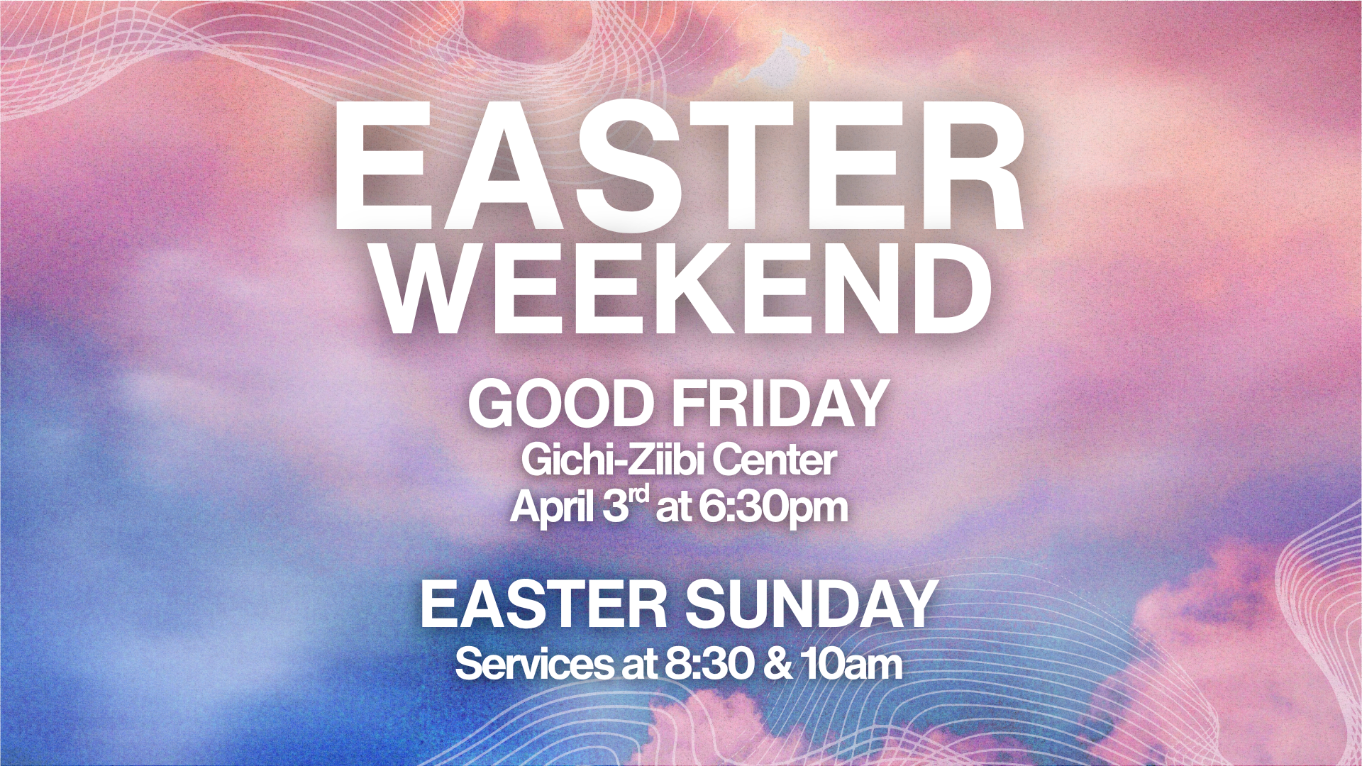 Join us for the Easter weekend! We will begin with the community Good Friday service at the Gichi Ziibi Center @ 6:30pm. Then join us on Sunday as we celebrate our risen Savior Jesus! Our services will be at 8:30am and 10am with a donut and coffee fellowship between services. We look forward to seeing you this weekend!